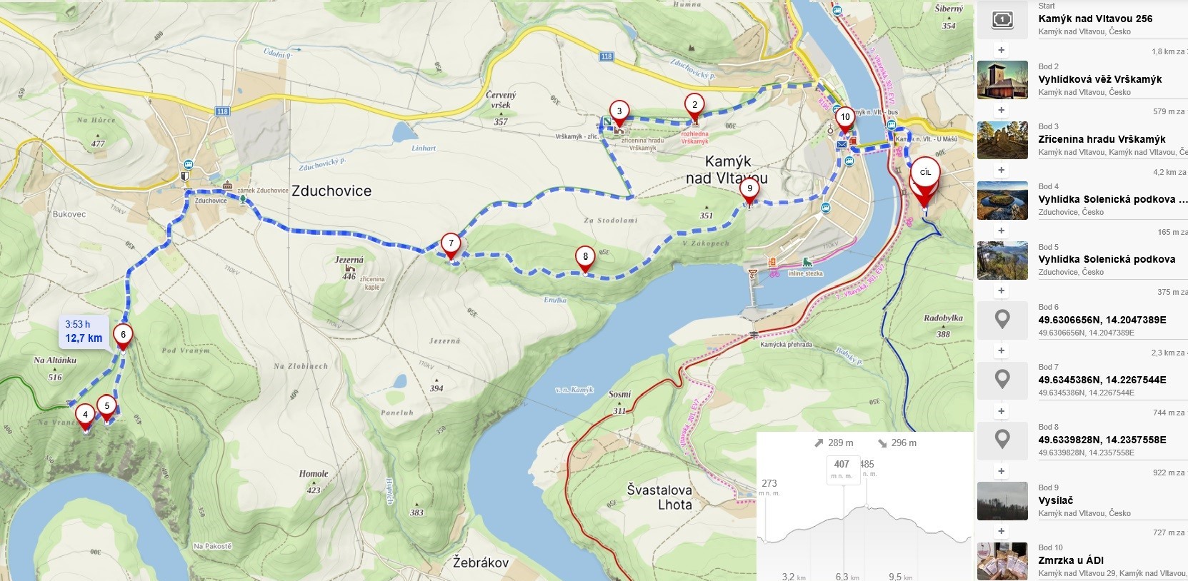 Zpět se pak dostanete, když půjdete dále ke druhé vyhlídce a po neznačené polní cestě zpět do Zduchovic. Odtud doporučujeme polní cestu okolo vrchu Jezerná a pak okolo zatopeného lůmku k vysílači nad přehradou. Z kopce sejdete do centra obce před most, kde se za sportovní výkon můžete odměnit vyhlášenou zmrzlinou U Ádi. V nohách budete mít 12,5 km.